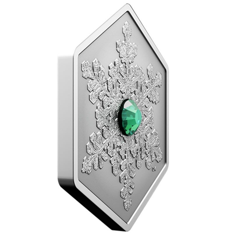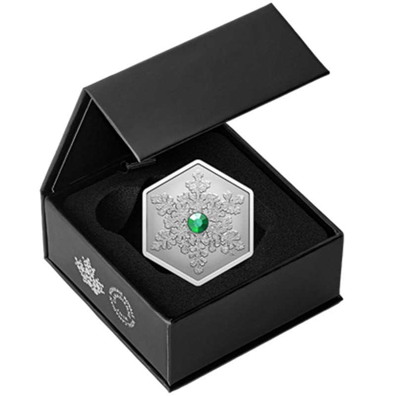 Эта чудесная серебряная монета от Канадского монетного двора – третья из серии «Снежинка». У неё качество пруф и вставка из кристалла зеленого цвета.