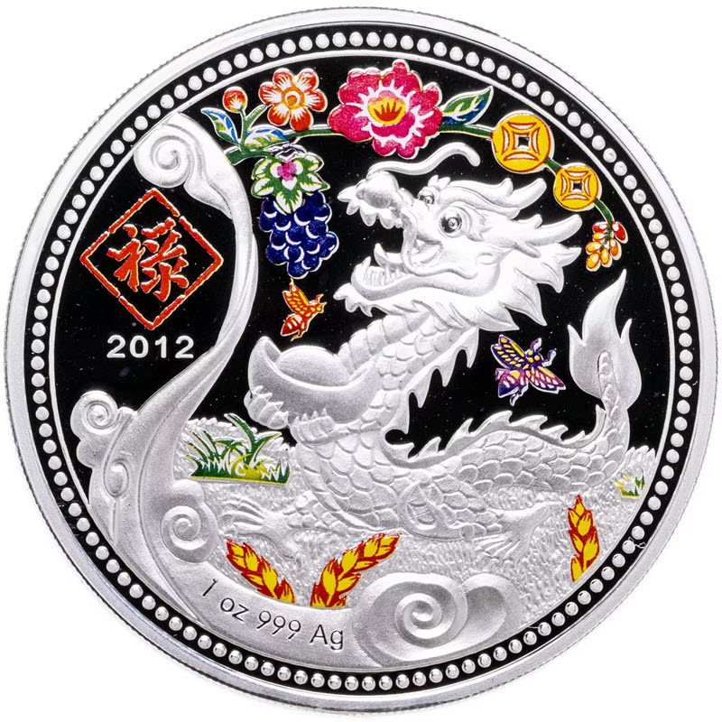 На реверсе изображен Дракон на цветочном фоне. Слева надпись: 壽 2012 (дракон, год чеканки), внизу: 1 oz 999 Ag (вес и проба серебра).