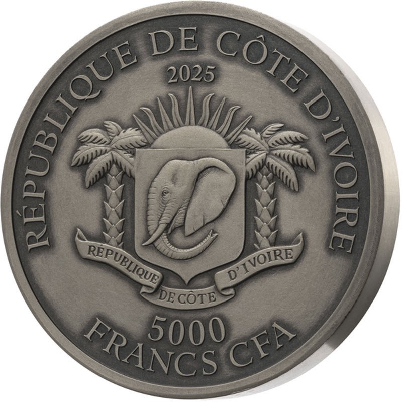 На аверсе изображен герб Кот-д’Ивуара. Вверху вдоль канта надпись: RÉPUBLIQUE DE CÔTE D'IVOIRE (страна-эмитент), под ней: 2025 (год чеканки). Внизу надпись в две строки: 5000 FRANCS CFA (номинал). На гурте выгравирован индивидуальный номер монеты.