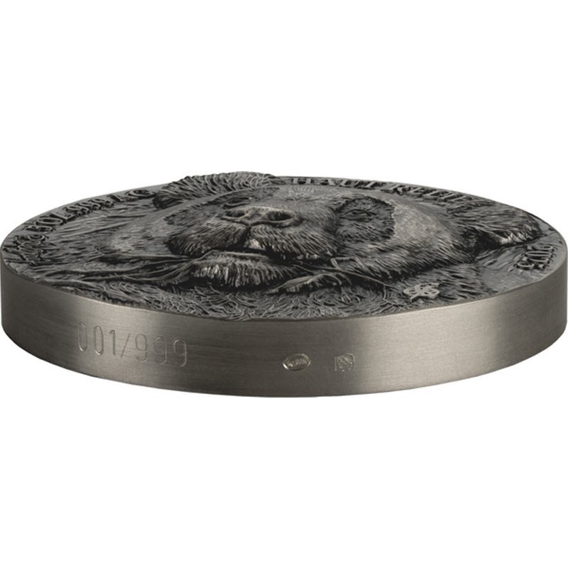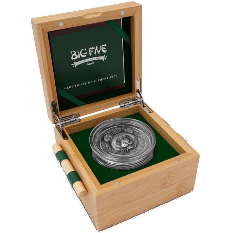 Это серебряная монета из серии «Большая пятерка Азии». Дизайн был реализован медальерами студии П. Де Грефа (на реверсе монограмма студии) на высочайшем уровне, даже такие тонкости, как шерсть, впечатляюще смотрятся. У нее невероятный горельеф и античная отделка. Индивидуальная нумерация на гурте. Поставляется в роскошном деревянном футляре с сертификатом подлинности. Тираж: 999 штук.