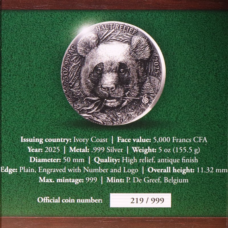 На реверсе изображена голова большой панды, поедающей бамбуковые побеги на фоне пышной растительности. Справа внизу монограмма дизайнера db (Beni Debacker). Вдоль канта надпись: P.DeGreef 5OZ .999 AG HAUT-RELIEF 2025 (монограмма П. де Грефа, вес и проба серебра, высокий рельеф, год чеканки).