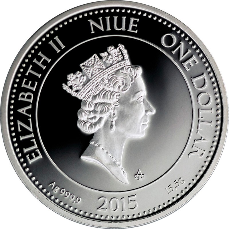 В центре - портрет Ее Величества Королевы Елизаветы II дизайнера Р.Д. Маклауфа (Raphael David Maklouf). Около портрета – AT – название серии. Вдоль канта надпись: 1 DOLLAR ∙ ELIZABETH II NIUE ONE DOLLAR ∙ 2015 15,55g Ag 999,9 (номинал, Елизавета II, страна-эмитент, номинал, год чеканки, вес и проба серебра).