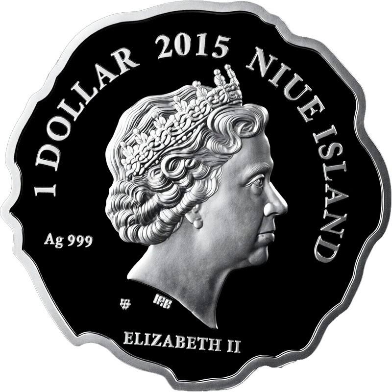В центре - портрет Ее Величества Королевы Елизаветы II работы дизайнера Яна Рэнка-Бродли (инициалы IRB под срезом шеи). Вверху полукругом – Ag 999 1 DOLLAR 2015 NIUE ISLAND (проба серебра, номинал, год чеканки, страна-эмитент), внизу - m/w ELIZABETH II (монограмма Польского монетного двора, Елизавета II).