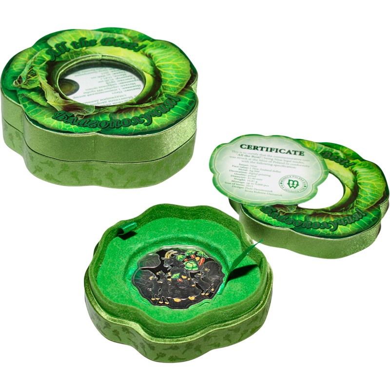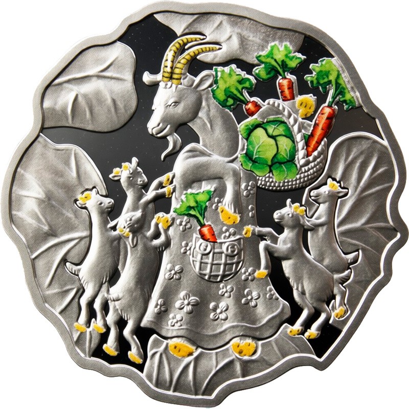 Эта чудесная серебряная монета необычной формы Польского монетного двора приурочена к Году Козы по восточному календарю.  Необычная форма этой монеты в виде капустного листа выбрана неслучайно: в китайской культуре капуста («бай цай») созвучна с понятием «сто богатств» и считается талисманом для привлечения денег.