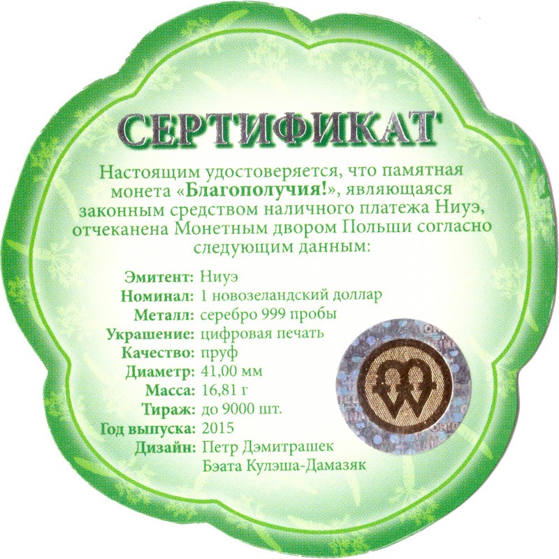 Серебряная монета Ниуэ "Благополучия!" 2015 г.в., 16.81 г чистого серебра (проба 999)