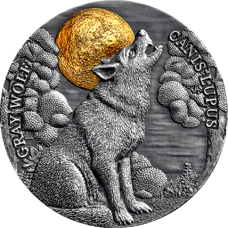 На реверсе монеты изображен волк, воющий на позолоченную луну. Слева на реверсе надпись: "GRAY WOLF" - название монеты.
