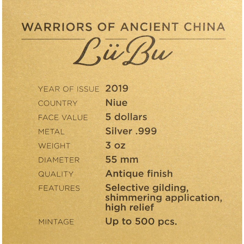 Серебряная монета Ниуэ "Древние китайские воины: Лю Бу" 2019 г.в., 93.3 г чистого серебра (проба 999)