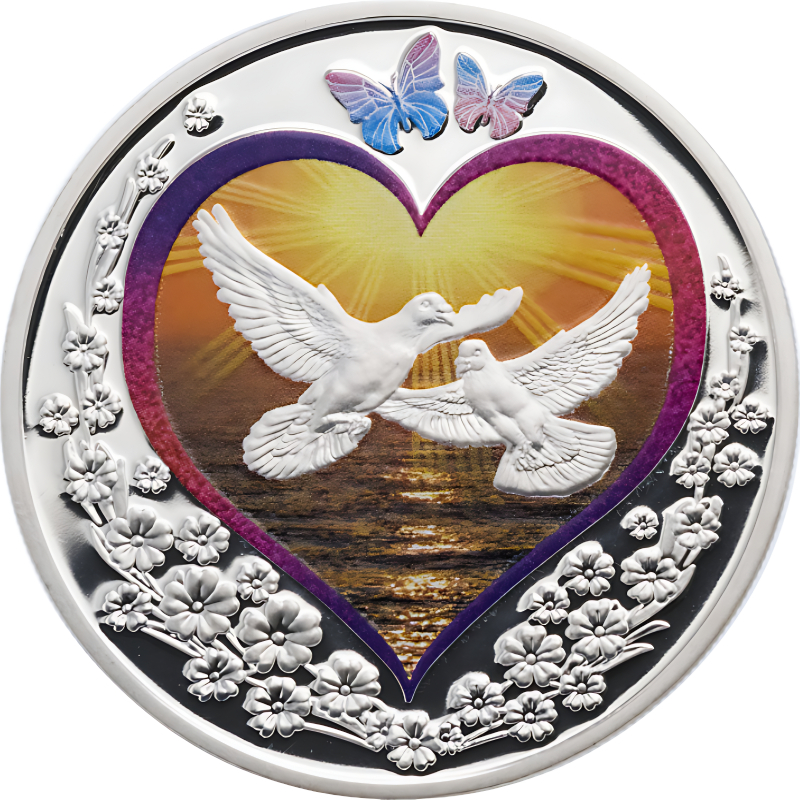 На реверсе на фоне моря и солнца - пара голубей, помещенная в контур сердца. Вверху - две цветные бабочки. Вдоль канта орнамент из цветов.