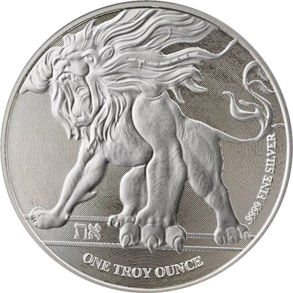 На реверсе изображен рычащий лев, с развевающейся гривой. Внизу надпись «ONE TROY OUNCE ,9999 FINE SILVER  (Одна тройская унция чистого серебра)