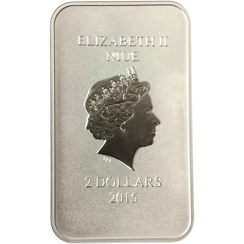В центре - портрет королевы Елизаветы II дизайнера Яна Рэнка-Бродли (IRB). Верху надпись в две строки: ELIZABETH II NIUE (Елизавета II, страна-эмитент), внизу - 2 DOLLARS 2015 (номинал, год чеканки).