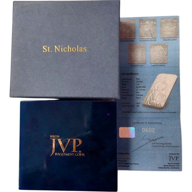 Эта чудесная серебряная прямоугольная монета весом в 1 унцию из серии «Православные святыни» посвящена святому Николаю Чудотворцу, выполнена в виде иконы.