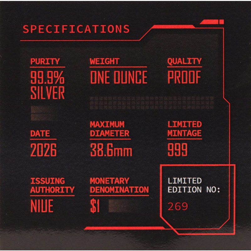На аверсе изображен Его Величество король Чарльз III. На усечении шеи инициалы дизайнера JC (Jody Clark). Вдоль канта надпись: CHARLES III · NIUE 2026 · ONE DOLLAR · 1oz 999 SILVER · (Чарльз III, страна-эмитент, год чеканки, номинал, вес и проба серебра).