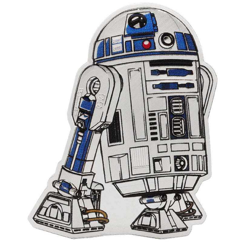 Серебряная монета Ниуэ весом 1 унция от Монетного двора Новой Зеландии посвящена дроиду R2-D2. У нее размеры 33 Х 44мм, качество пруф, селективная окраска и высокий рельеф. Поставляется в оригинальном футляре с сертификатом подлинности. Тираж: 2000 штук.