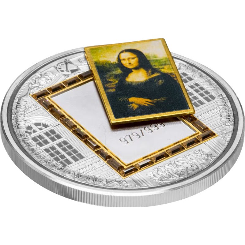 "Леонардо да Винчи. Мона Лиза" — третья монета из серии «Шедевры искусства». Нумизматический шедевр, изготовленный из чистого серебра весом 3 унции и чистого золота весом 7.78 граммов с 26 кристаллами Сваровски, инкрустированными в эту 55-миллиметровую монету. Золотая вставка имеет размеры 28.5 x 19.5 мм, на обратной стороне указан индивидуальный номер монеты и надпись: 7.78 G = 1/4 OZ .999 FINE GOLD (вес и проба золота). Монета в оригинальном футляре с сертификатом подлинности. Тираж: 999 штук.
