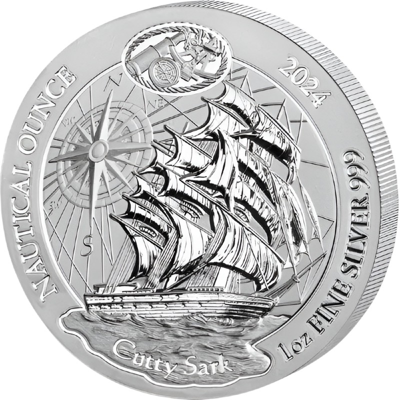 На реверсе изображен клипер «Cutty Sark» на фоне стилизованного компаса. По ободу полукругом надписи: NAUTICAL OUNCE Cutty Sark 1 oz FINE SILVER 999 2024 (серия, корабль, вес и проба серебра, год чеканки). По центру над кораблем изображены различные морские инструменты.