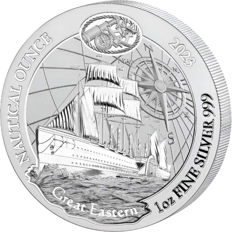 Эта чудесная 1 унцовая серебряная монета из серии «Морская унция» с изображением легендарного парусного парохода «Грейт-Истерн».