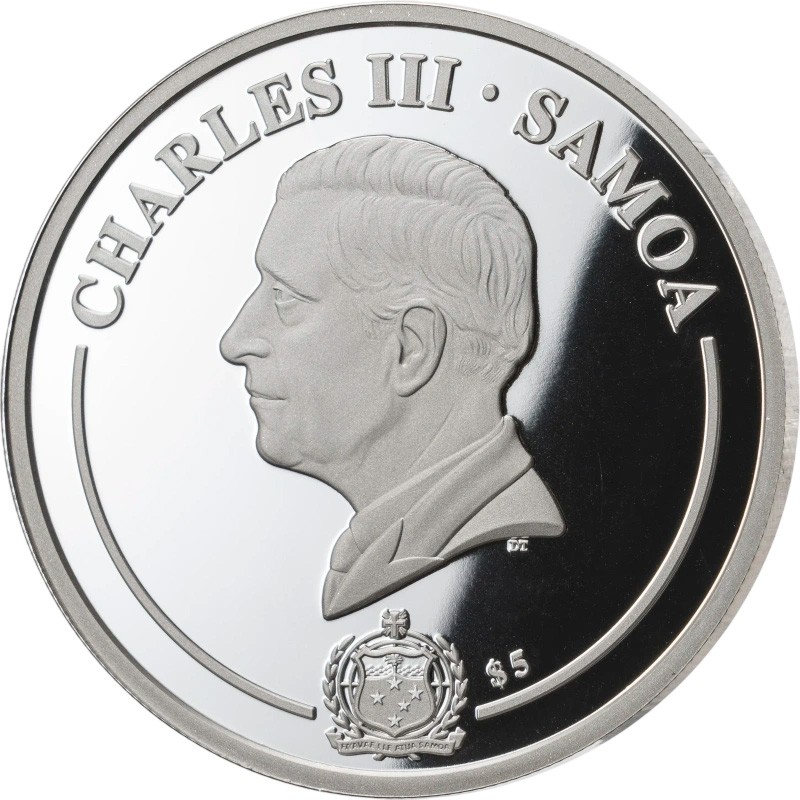 В центре монеты – портрет Его Величества короля Чарльза III дизайнера Дэна Торна (Dan Thorne). Вверху надпись - CHARLES III ∙ SAMOA (Чарльз III, страна-эмитент). Внизу - герб Самоа – щит, увенчанный изображением Южного Креста. Девиз на ленте: FA'AVAE I LE ATUA SAMOA (Бог — основа Самоа). Справа - 5$ (номинал).