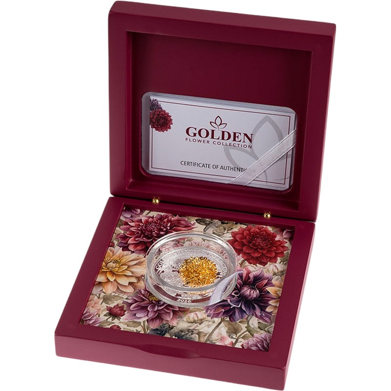Эта удивительная 1 унцовая серебряная монета «Георгин» (Dahlia) - седьмая в популярной серии «Golden Flower Collection» (Коллекция золотых цветов). Главной особенностью монеты является объемный цветок георгина, выполненный с помощью инновационной 3D-технологии и покрытый 24-каратным золотом.  Георгин в этой коллекции символизирует достоинство, элегантность и творчество.