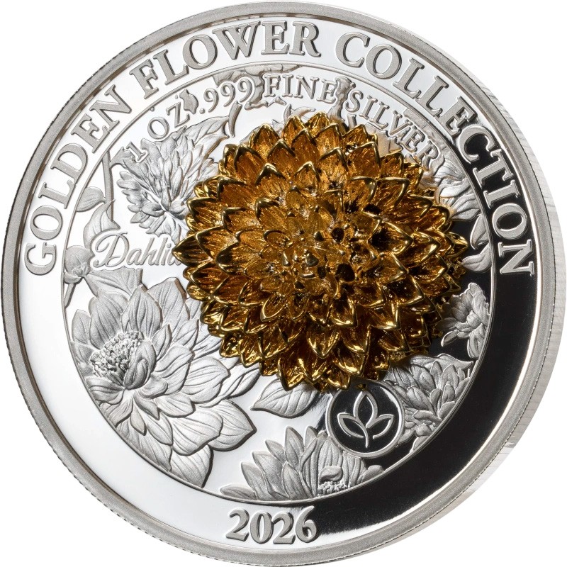 В центре монеты - трехмерная золотая фигурка георгина на фоне изображений других цветов. Вверху полукругом надпись: GOLDEN FLOWER COLLECTION (название серии). Под ней полукругом — 1 OZ .999 FINE SILVER (вес и проба серебра). Слева от цветка его название - Dahlia (Георгин). Справа от цветка - графическое изображение бутона, заключенное в круг - отличительный знак коллекции. Внизу год чеканки — 2026.