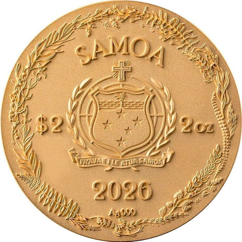 Над гербом надпись: SAMOA (страна-эмитент), внизу — 2026 (год чеканки) и под ним — Ag 999 (проба серебра), слева — 2$ (номинал), справа — 2 OZ (вес серебра). Вдоль канта - венок из трав и цветов, которые отражают природную тему реверса.