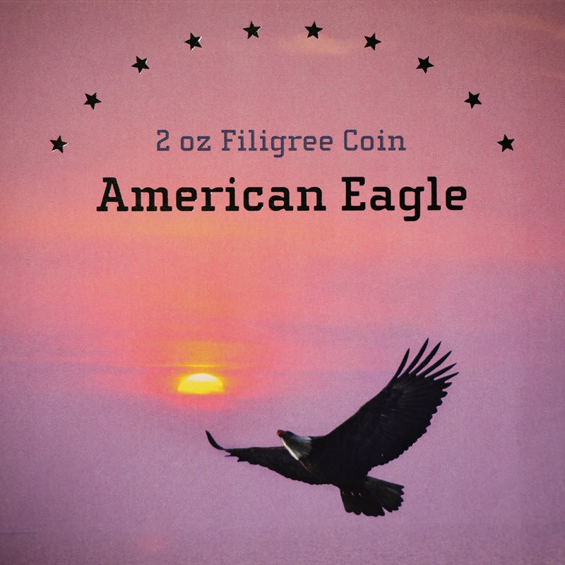 Эта удивительная серебряная монета весом 2 унции посвящена 40-летию монеты «Американский орел». У нее техника филиграни, качество пруф-лайк, голографический эффект и выборочное золочение в 24К. Поставляется в оригинальном футляре с сертификатом подлинности. Тираж: 1986 штук.