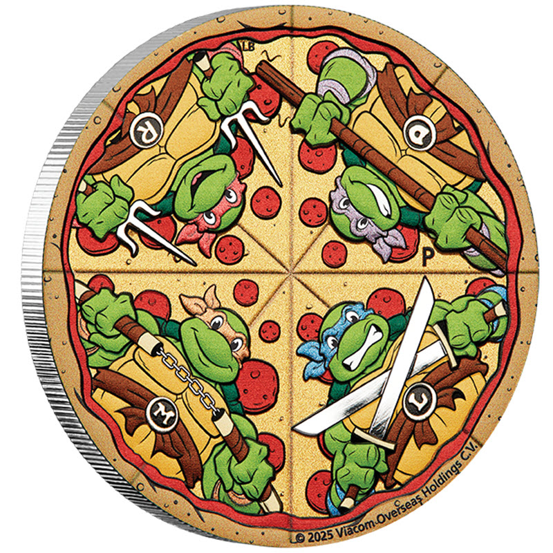 Эта удивительная серебряная монета весом в 2 унции от Пертского монетного двора посвящена пицце, любимому блюду Черепашек-ниндзя. Дизайнер Lucas Bowers. У неё размеры 50,8 Х 4,8 мм, качество BU и селективная окраска. Поставляется в оригинальной упаковке с сертификатом подлинности. Тираж: 1000 штук.