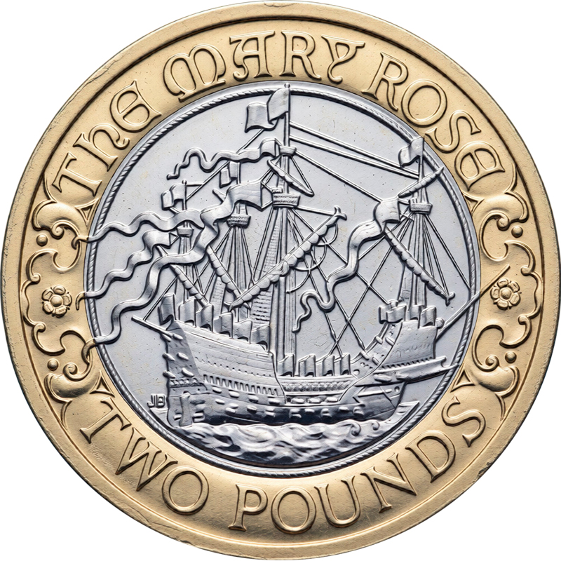 В центре - рельефное изображение парусника «Мэри Роуз» в открытом море. Возле кормы корабля - инициалы дизайнера Джона Бергдала (JB). Вверху полукругом надпись: THE MARY ROSE (Мэри Роуз), внизу - TWO POUNDS (номинал). Надписи смыкаются по краям фигурными виньетками. На рубчатом гурте монеты имеется надпись: YOUR NOBLEST SHIPPE 1511 (Ваш благороднейший корабль 1511).