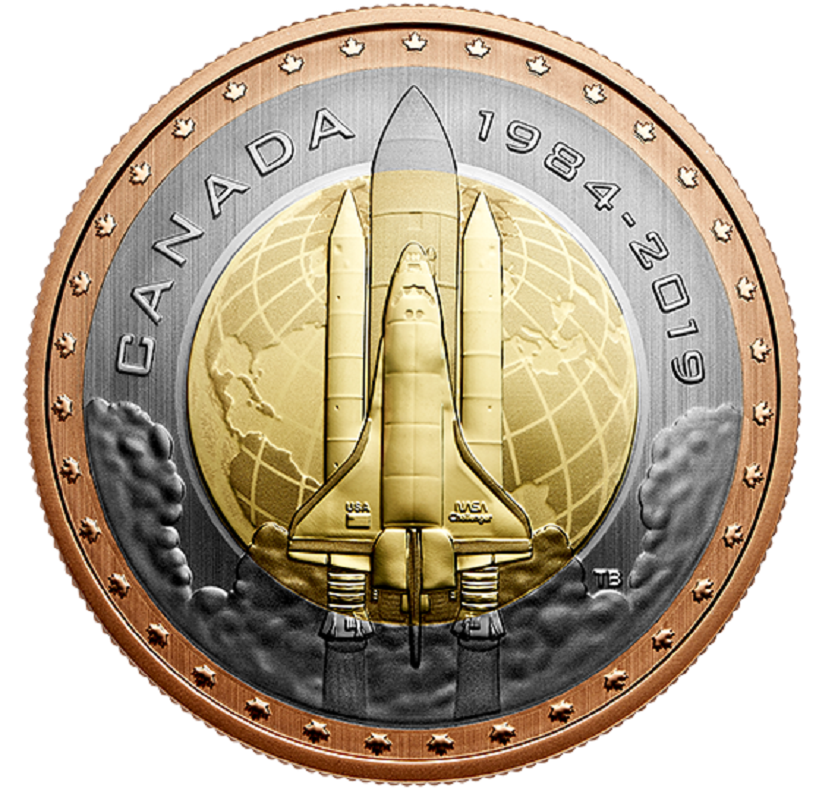 На реверсе изображено центральное изображение Челленджера, наложенное на Землю. Реалистичный дизайн космического челнока окружен концентрическими кругами, представляющими различные участки атмосферы Земли. Внутреннее ядро ​​представляет собой тропосферу, в которой запущен челнок, внутреннее кольцо - это термосфера, в которой вращается челнок, а внешнее кольцо - это внешнее пространство. 35 кленовых листьев, которые украшают внешнее кольцо, представляют собой отмеченные 35 лет, также обозначенные как «1984–2019», как напечатано на монете вместе с «КАНАДА».
