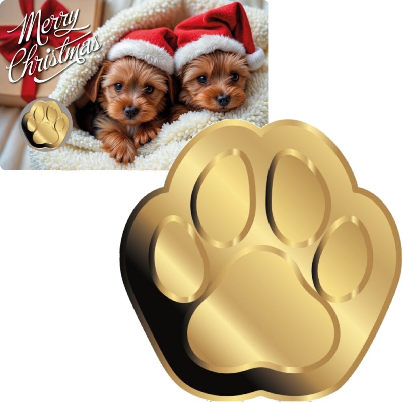 На реверсе изображены свеча, ёлка, отпечаток собачьей лапы.