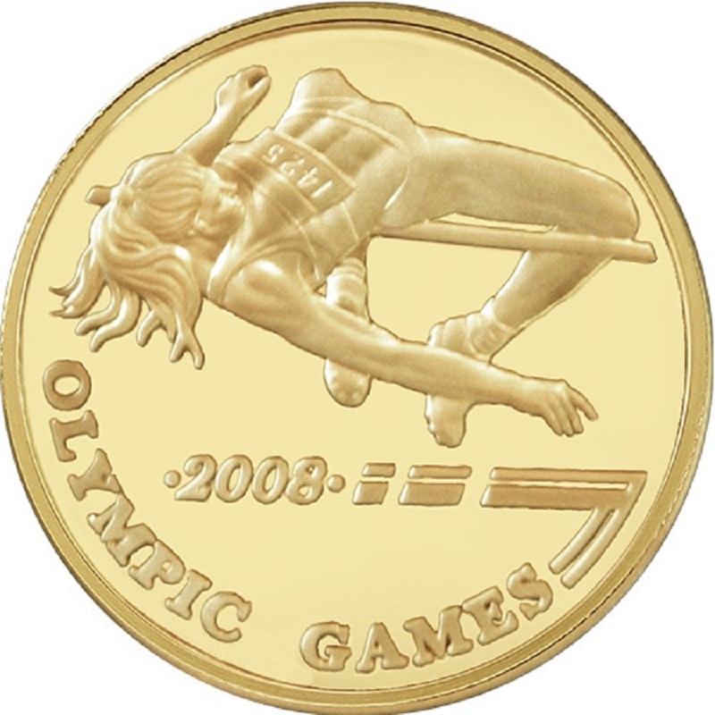 изображение спортсмена во время соревнований по прыжкам в высоту. Внизу цифра «2008», обозначающая год проведения Олимпийских игр, и по окружности надпись «OLYMPIC GAMES» на английском языке.
