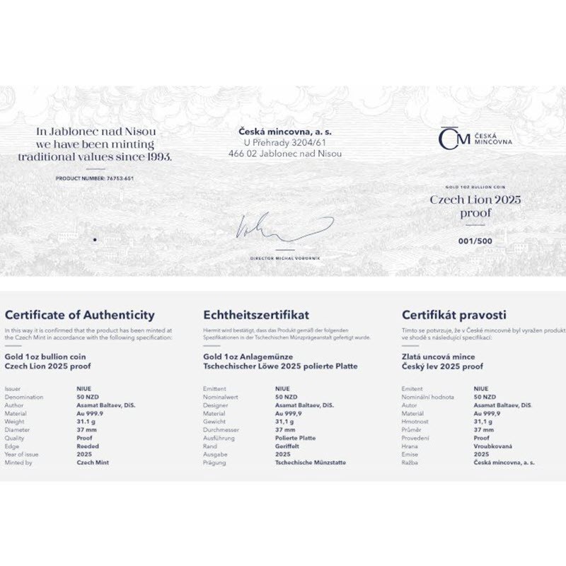 Золотая монета Ниуэ "Чешский лев" 2025 г.в. (пруф), 31.1 г чистого золота (проба 9999)