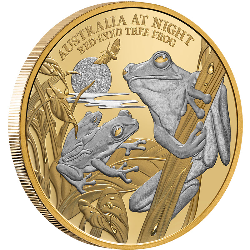 На реверсе изображены три лягушки на фоне луны. Луна и лягушки имеют платиновое покрытие. Вверху, в две строки надпись: AUSTRALIA AT NIGHT RED-EYED TREE FROG.