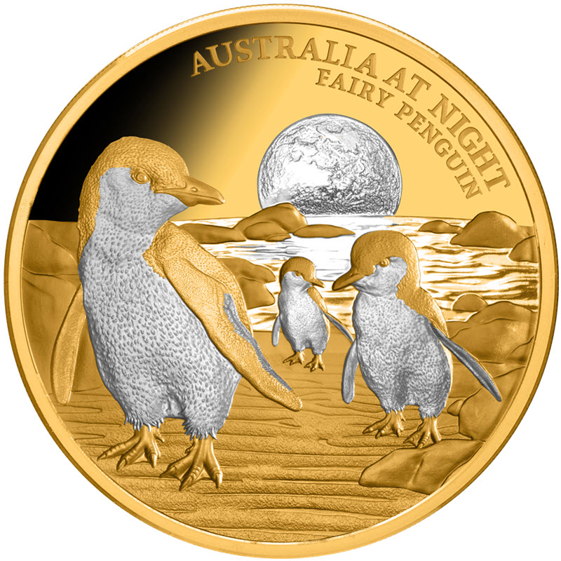 Десятая золотая монета из серии «Ночная Австралия» посвящена Сказочному пингвину. Дизайн дополнен селективным платиновым покрытием. Она помещена в оригинальный футляр с пронумерованным сертификатом подлинности. Тираж: 150 штук.