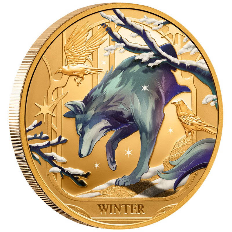 Эта чудесная золотая монета весом в 1 унцию – четвертая из серии «Времена года» - посвящена волку в зимний период. У нее качество пруф и селективная окраска. Поставляется в оригинальном футляре с сертификатом подлинности. Тираж: 99 штук.