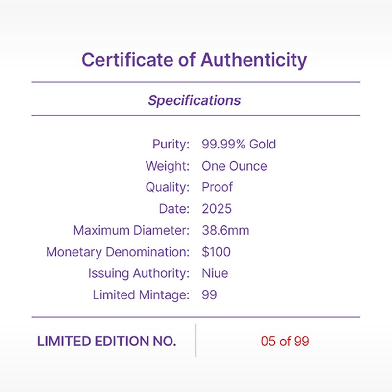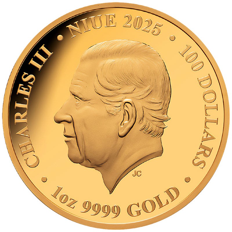 На аверсе изображен Его величество Король Чарльз III работы дизайнера Джоди Кларк (JC, Jody Clark). Вдоль канта надпись: CHARLES III · NIUE 2025 · 100 DOLLARS · 1OZ 9999 GOLD · (Чарльз III, страна-эмитент, год чеканки, номинал, вес и проба золота).