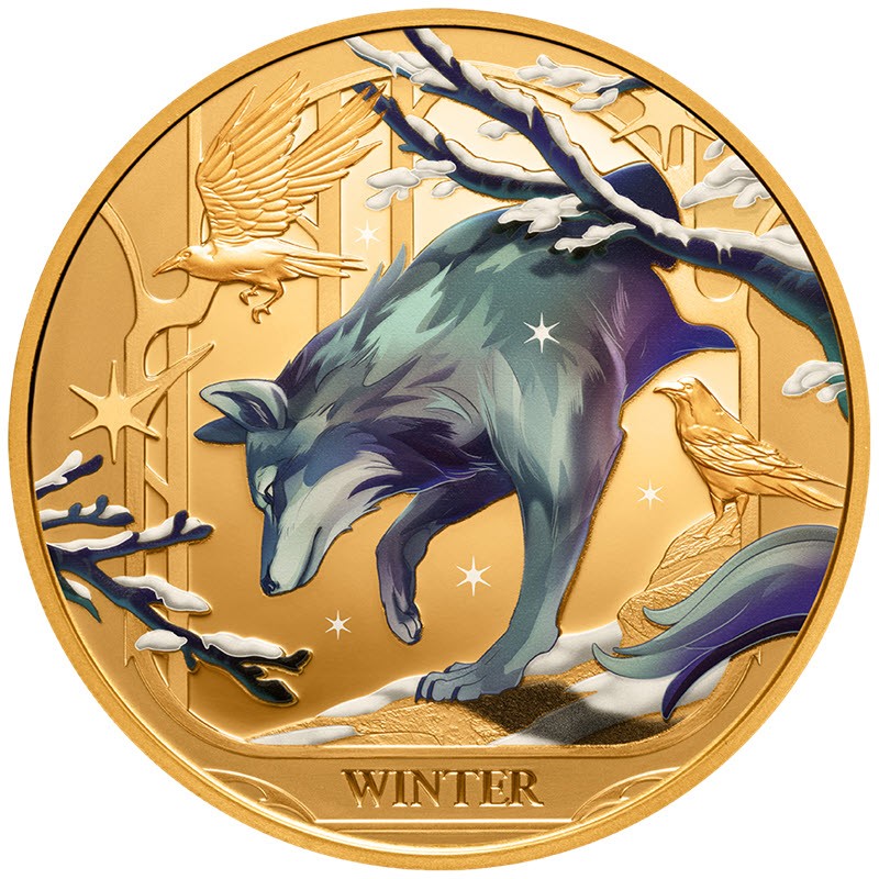 На реверсе изображен волк на фоне зимнего леса в окружении ворон. Внизу надпись: WINTER (Зима).