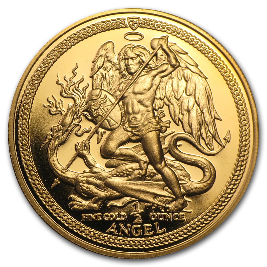 Золотая монета Острова Мэн «Ангел, сражающийся с драконом» изображает Архангела Михаила, борюшегося с дьяволом в обличье дракона. Образ Архангела Михаила помещается на монеты со Средних веков. По преданию, такая монета приносит удачу и здоровье ее обладателю.