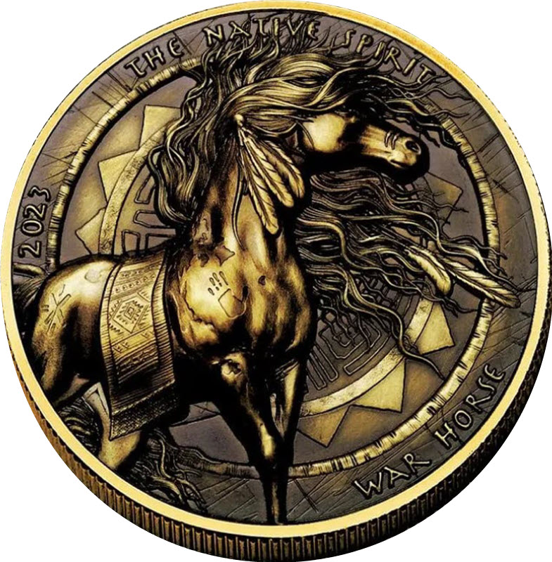 На реверсе изображен Конь для битвы, покрытый попоной, и его ноздри улавливают запах предстоящей битвы. Он ждет, когда его развевающуюся гриву заплетут. Как только это будет сделано, он и его всадник, вооруженный копьем и боевой дубинкой, отправятся в путь, чтобы отсчитать победу над своими врагами. Вдоль канта надпись: THE NATIVE SPIRIT WAR HORSE 2023 (Природный дух, боевой конь, год чеканки).