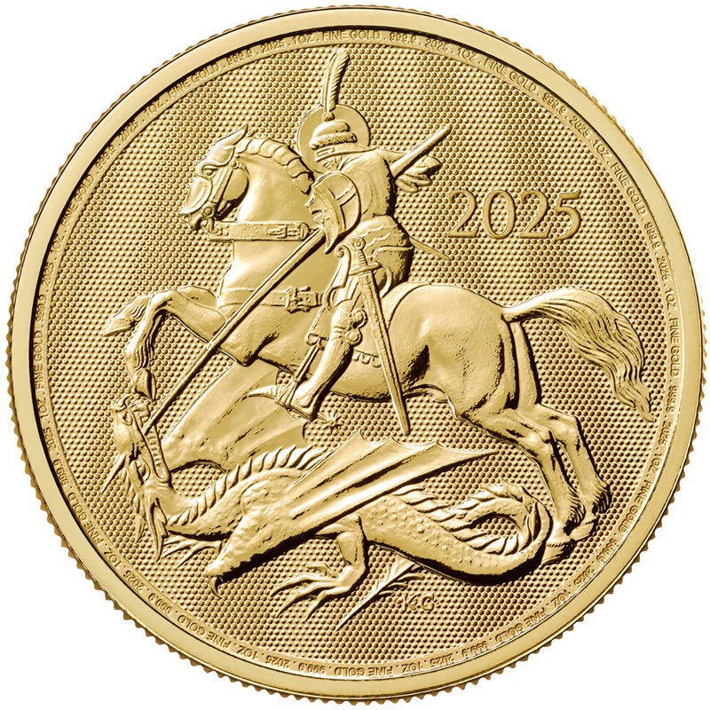 Золотая монета Великобритании «Святой Георгий и дракон» 2025 года от Королевского монетного двора весом в 1 унцию — вторая в серии инвестиционных монет, посвященных этой легендарной истории.