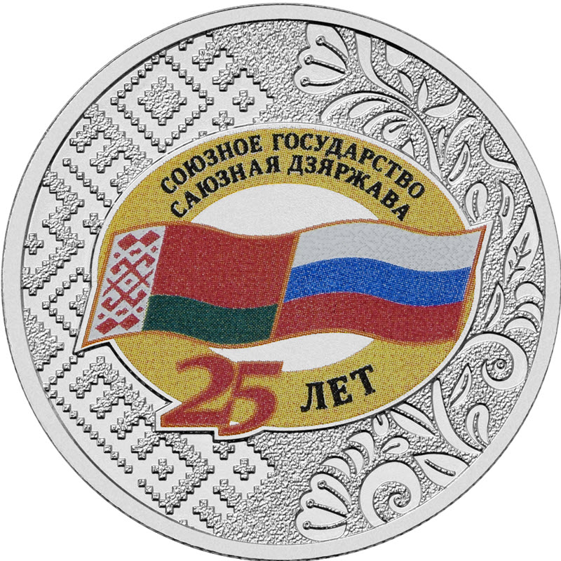 На реверсе на фоне композиции из белорусского и русского орнаментов изображена цветная символика, посвященная 25-летию со дня подписания Договора о создании Союзного государства. На символике надпись: СОЮЗНОЕ ГОСУДАРСТВО (на русском и белорусском языках) 25 ЛЕТ.