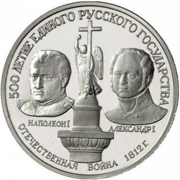Платиновая монета СССР «Отечественная война 1812 года» 1991 года выпуска входит в серию «500-летие единого русского государства».