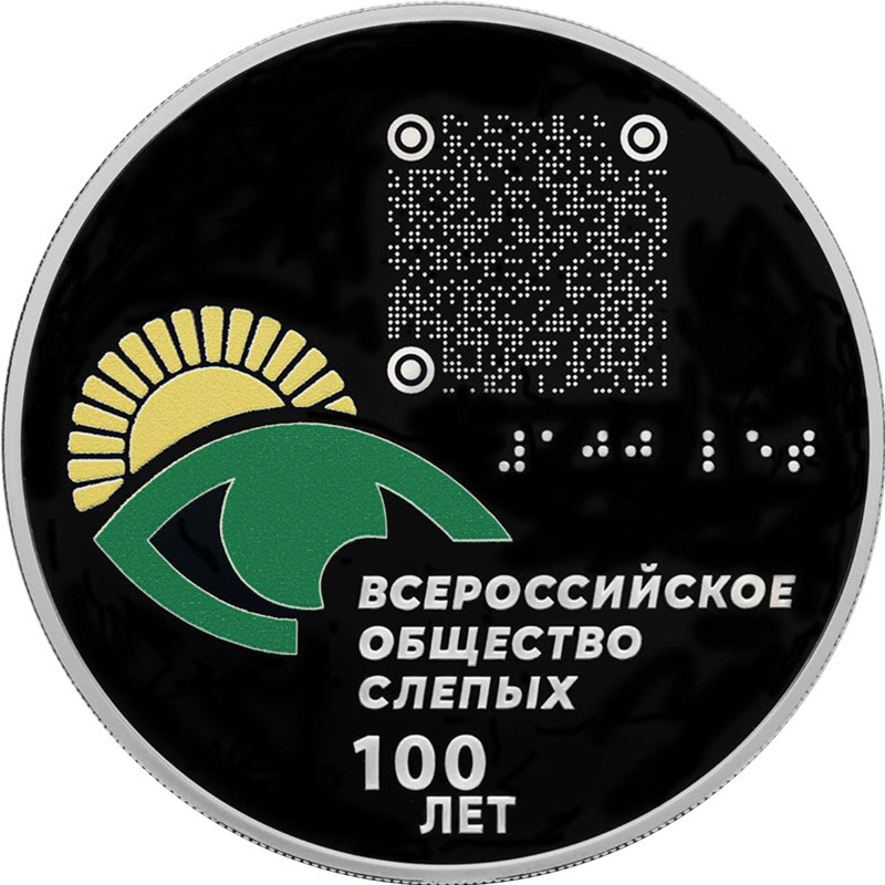 Серебряная монета России "100-летие Всероссийского общества слепых" 2025 г.в. (пруф), 31.1 г чистого серебра (проба 925)