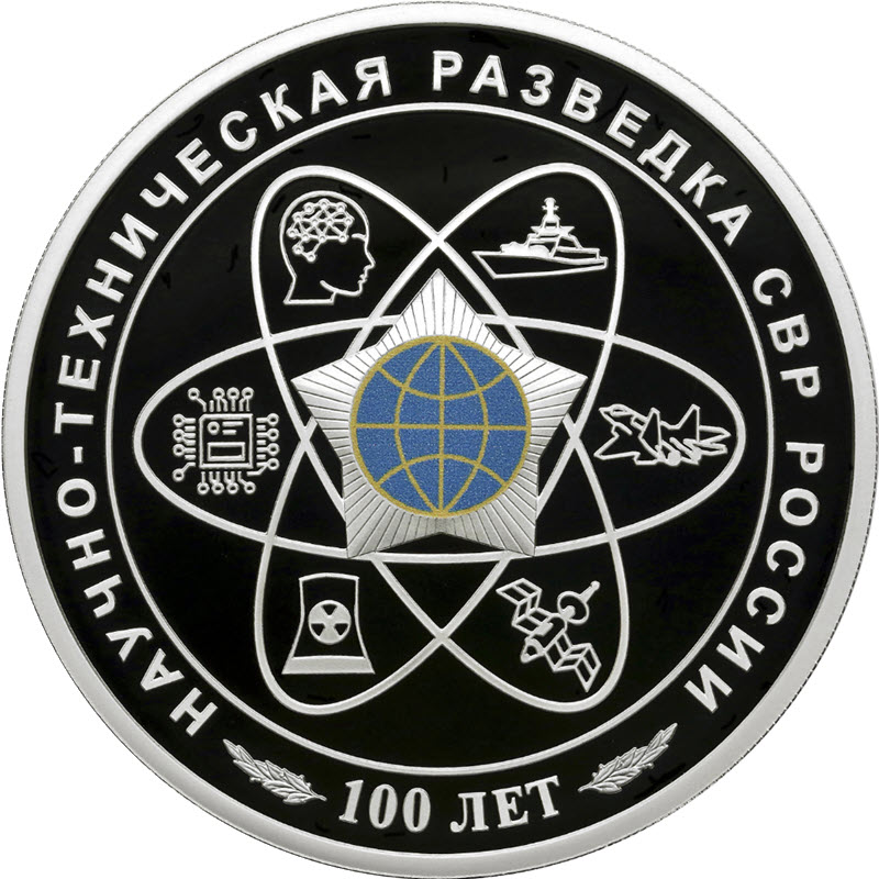 На реверсе внутри стилизованных орбит атома - схематичные изображения военного корабля, истребителя, искусственного спутника Земли, атомной электростанции, микросхемы и искусственного интеллекта. В центре – малая эмблема СВР. Вдоль канта надпись: НАУЧНО-ТЕХНИЧЕСКАЯ РАЗВЕДКА СВР РОССИИ 100 ЛЕТ.