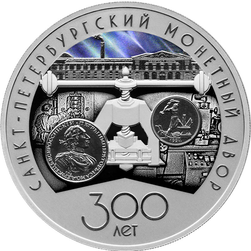 На реверсе изображения винтового пресса для чеканки монет, аверса рубля 1724 года чеканки и реверса полтинника образца 1924 года, фасад здания Санкт-Петербургского монетного двора. Вдоль канта надпись: САНКТ-ПЕТЕРБУРГСКИЙ МОНЕТНЫЙ ДВОР 300 ЛЕТ.