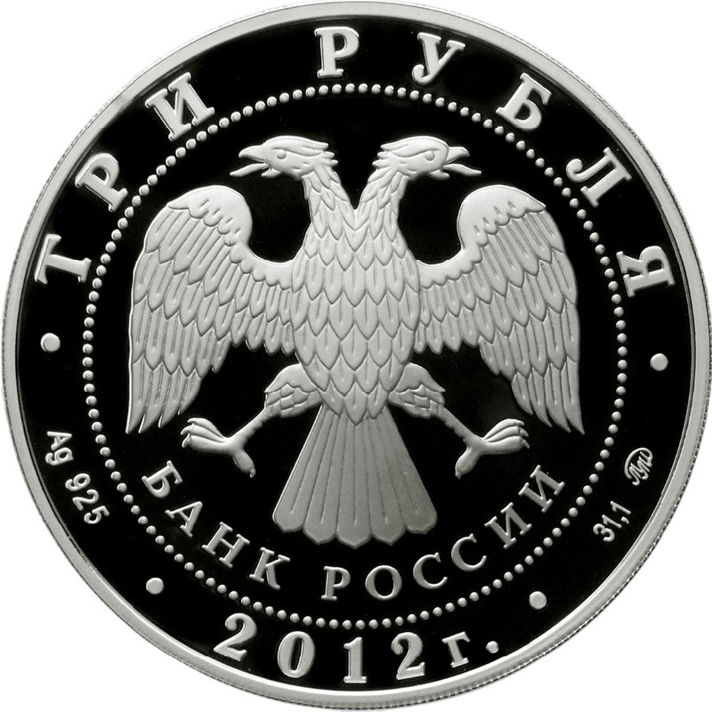 В центре — эмблема Банка России, под ним надпись полукругом БАНК РОССИИ, обрамленная кругом из точек и надписями по кругу: вверху — ТРИ РУБЛЯ, внизу — 2012 г.(год чеканки), слева — Ag 925 (проба серебра), справа — 31,1 ММД (вес серебра и монограмма монетного двора).