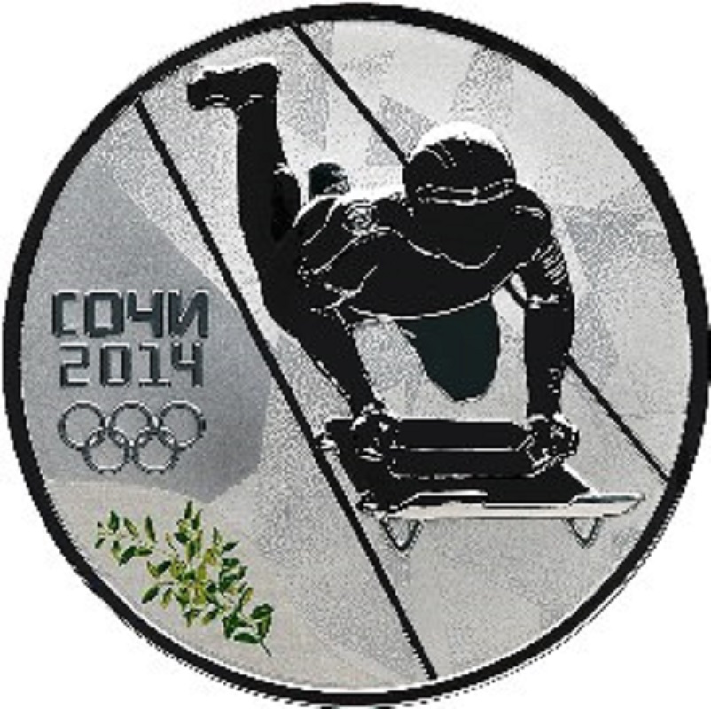 на матовом поле диска в центре - рельефное изображение скелетониста на трассе, обозначенной двумя линиями, слева от него в две строки - надпись: "СОЧИ" и дата: "2014", под ними - пять Олимпийских колец, внизу слева у канта - цветное изображение веточки самшита.
