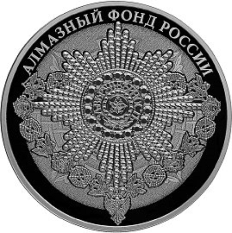 в центре диска – на фоне элементов традиционного русского орнамента изображение звезды Ордена Святого апостола Андрея Первозванного, под ним большая цепь со знаком Ордена Святого апостола Андрея Первозванного, вверху вдоль канта – надпись: "АЛМАЗНЫЙ ФОНД РОССИИ".