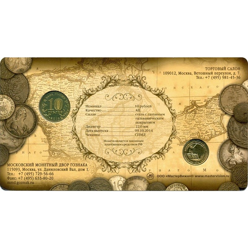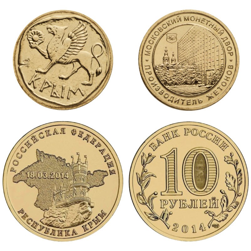 Блистер с монетой и жетоном 2014 г. «Республика Крым» посвящен её вхождению в состав Российской Федерации. У них качество анциркулейтед. Тираж: 2000 штук.