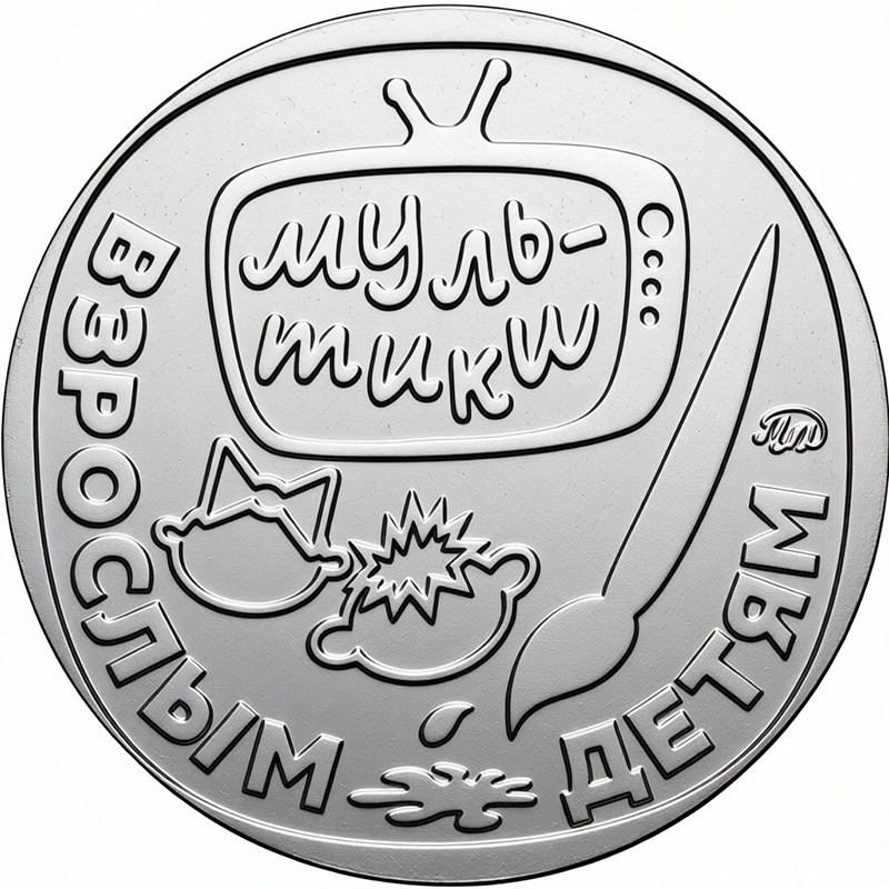 На аверсе изображены экран телевизора и кисть художника. Надпись: МУЛЬТИКИ ВЗРОСЛЫМ ДЕТЯМ. Справа – монограмма монетного двора ММД.