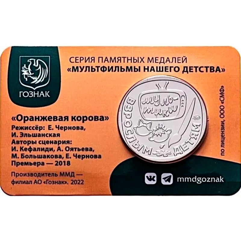 «Оранжевая корова» — третий жетон серии «Мультфильмы нашего детства». Это совместный проект Московского монетного двора и киностудии «Союзмультфильм».